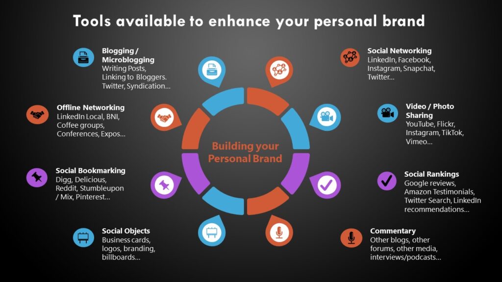 Cách khác là tạo trang web, trang cá nhân trên mạng xã hội của riêng bạn với thông tin về bạn là ai và những dịch vụ bạn cung cấp. Một cách khác, nếu bạn là một doanh nhân, là tạo blog của riêng bạn, nơi bạn có thể viết về những thăng trầm của việc điều hành một doanh nghiệp.